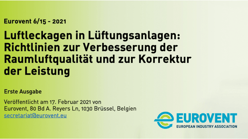 In der Eurovent-Empfehlung 6/15 werden die wichtigsten Maßnahmen dargelegt, die bei der Auslegung und Einstellung einer Anlage zur Minimierung von Leckagen zu berücksichtigen sind und Leitlinien zur Korrektur der erklärten Leistung aufgrund von Leckagen bereitgestellt. Die Empfehlung wurde gemeinsam von den Teilnehmern der Eurovent Produktgruppen „Air Handling Units“ (PG-AHU) und „Energy Recovery Components“ (PG-ERC) ausgearbeitet und richtet sich an die gesamte Lüftungs- und Klimatechnik, einschließlich Systemplaner, Installateure und Hersteller.