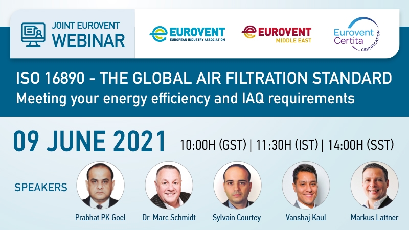 Brussels, Paris, Dubai, 19 May 2021. Eurovent, in cooperation with Eurovent Middle East and Eurovent Certita Certification, will host a dedicated webinar tailor-made for Africa, Middle East, India and Southeast Asia. The webinar will outline the importance of adherence to latest standards in air conditioning and ventilation. Special focus will be placed on the application of the newest air filtration standard ISO 16890, which has replaced EN 779 and other international standards in recent years.