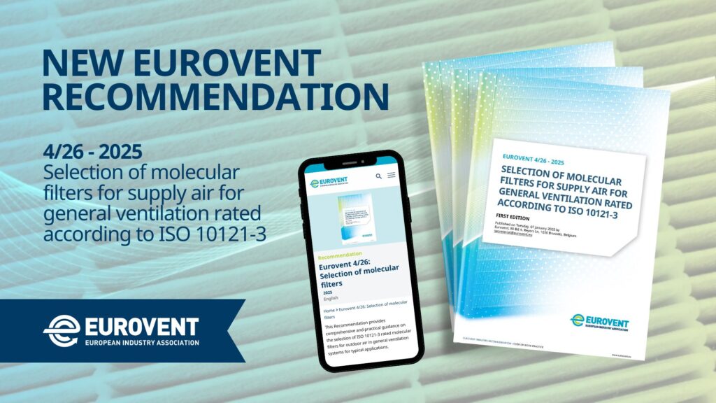Marc Schmidt, Chairperson of the Eurovent Product Group ‘Air Filters’ (PG-FIL), stated that: “In an excellent team effort of the Eurovent PG-FIL, the new Recommendation 4/26 ‘Selection of molecular filters’ was created. Although molecular filters have been used in the HVAC industry for many years, this recommendation closes a gap and provides customers with an easy-to-understand tool for selecting and using molecular filters. I am sure that also this document will be a useful guide in the HVAC industry and will be widely used. Thanks again to all participants of the Eurovent Product Group ‘Air Filters’ who have contributed.”