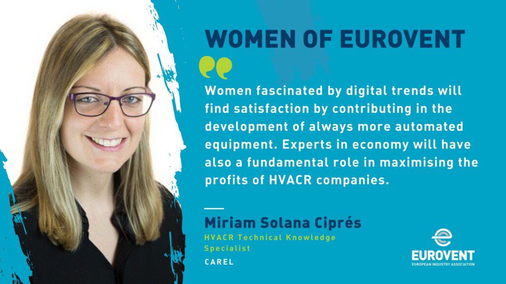 We are lucky to work in a sector where a great diversity of areas are covered, and very different profiles are welcome. Enthusiasm for technology will find lots of stimuli by understanding and working on the thermodynamics behind HVACR systems. Women fascinated by digital trends will find satisfaction by contributing to the development of more automated equipment and experts in the economy will have a fundamental role in maximising the profits of HVACR companies. Internal and external communication is essential to make known the new developments and general updates. These are just some examples, as the list of capacities and knowledge areas that one can apply in our sector is very long.