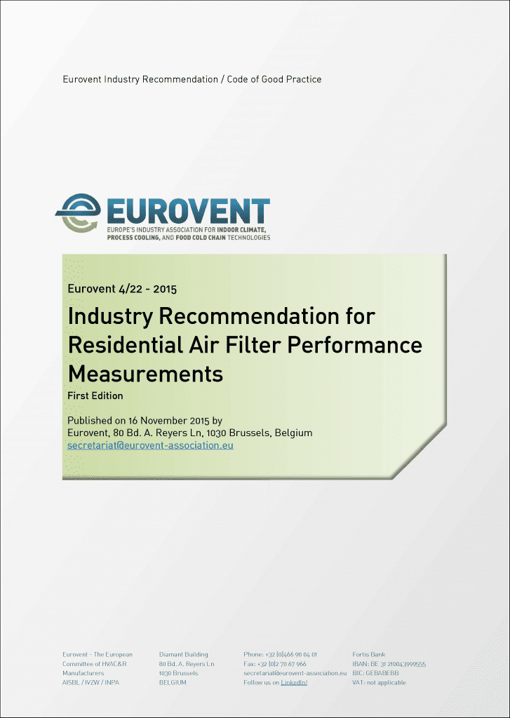 In November 2015, members of the Eurovent Product Group ‘Air Filters’ published the first edition of Recommendation 4/22, providing the industry as well as European institutions with a scheme for energy performance measuring. This Recommendation refers to particulate air filters for residential application having an efficiency ePM1 of less than 99 %. It describes the technical specifications, requirements and an efficiency classification system based upon fractional efficiency measurement and a Particulate Matter reporting system The method is applicable for filters having rated maximum air flow from 70 to 1000 m³/h. According to Mr Jan Andersson, Chairman of the Eurovent Product Group ‘Air Filters’, the new testing method would ‘bring clarity to the market by covering an area that had so far not been fully covered by ISO or EN standards’. He goes on stating that the industry recommendation would ‘contribute to a level-playing field through ensuring comparable test results that are based on the same testing method’. This document is available in English.