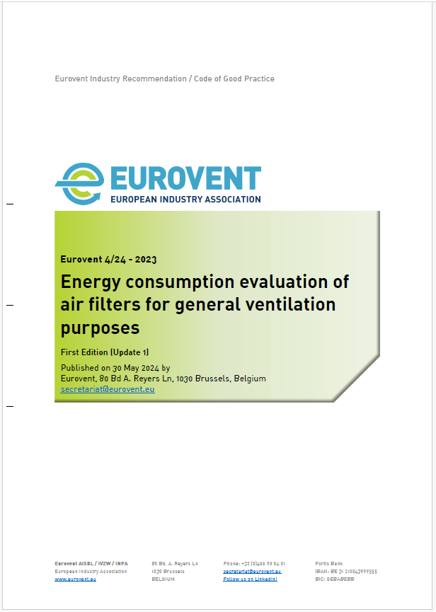 The purpose of this Recommendation is to provide a generic methodology for estimating energy consumption of air filters for general ventilation under actual operating conditions, taking into consideration: wide range of airflow rate, actual filter dimensions, approach to the filter change (condition based and time based method), actual operating time and actual fan efficiency. The document is built on the methodology defined in Eurovent 4/21 and implements the ISO 16890 classification, as well as its testing methods. This Recommendation, together with Eurovent 4/21 and Eurovent 4/25, forms a set of Eurovent documents for evaluation of energy consumption and energy efficiency of air filters. The differences between the scope of respective Recommendations are the following: Eurovent 4/21 is an integral Recommendation for energy rating and filter performance comparison at standard reference conditions as a basis for the certification programme and Eurovent 4/25 is a simplified version of this Recommendation to propose a consistent evaluation of energy consumption of air filters in the revised Regulation (EU) 1253/2014. This is the first edition of the document and it is the English version.