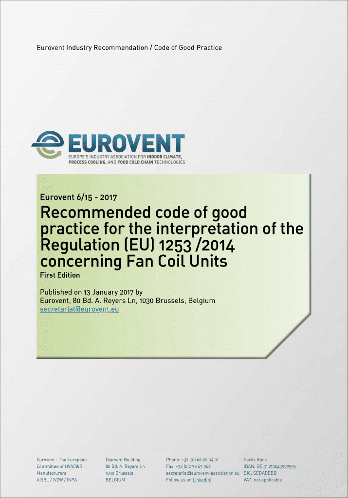 With this code of good practice, Eurovent and its members recommend that Fan Coil Units shall be considered as not covered by the Commission Regulation (EU) No 1253/2014 and they shall be considered as covered only by the Commission Regulation (EU) 2016/2281. This document is available in English.