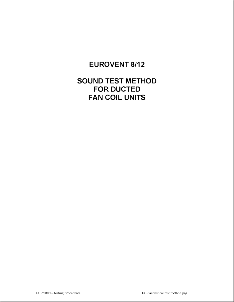 The purpose of this document is to describe the measurement method of Ducted Fan Coil Units sound power level, at speeds of choice with an available static pressure equal to 50 Pa at medium speed. The sound power levels are calculated in frequency bands from sound pressure level measurements in a double reverberation room. The test results describe the performance of the FC in the real condition of build installation where, as usual, the static pressure is fixed at medium speed. This document is available only in English.