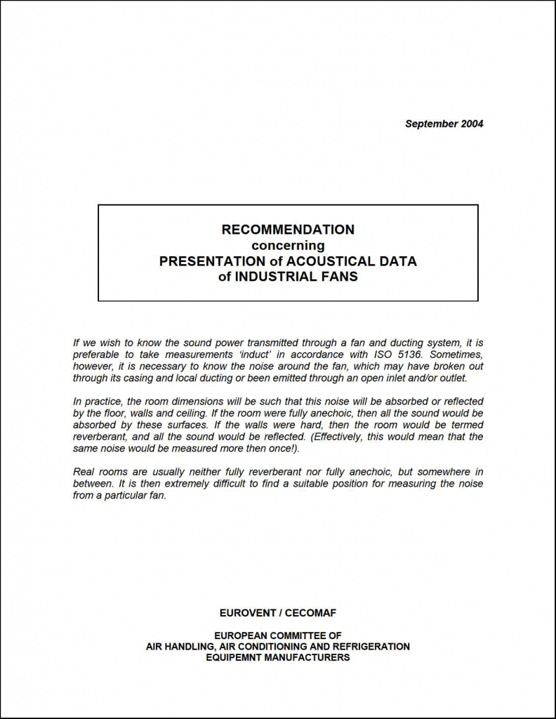 If we wish to know the sound power transmitted through a fan and ducting system, it is preferable to take measurements ‘induct’ in accordance with ISO 5136. Sometimes, however, it is necessary to know the noise around the fan, which may have broken out through its casting and local ducting or been emitted through an open inlet and/or outlet. This document is available only in English.