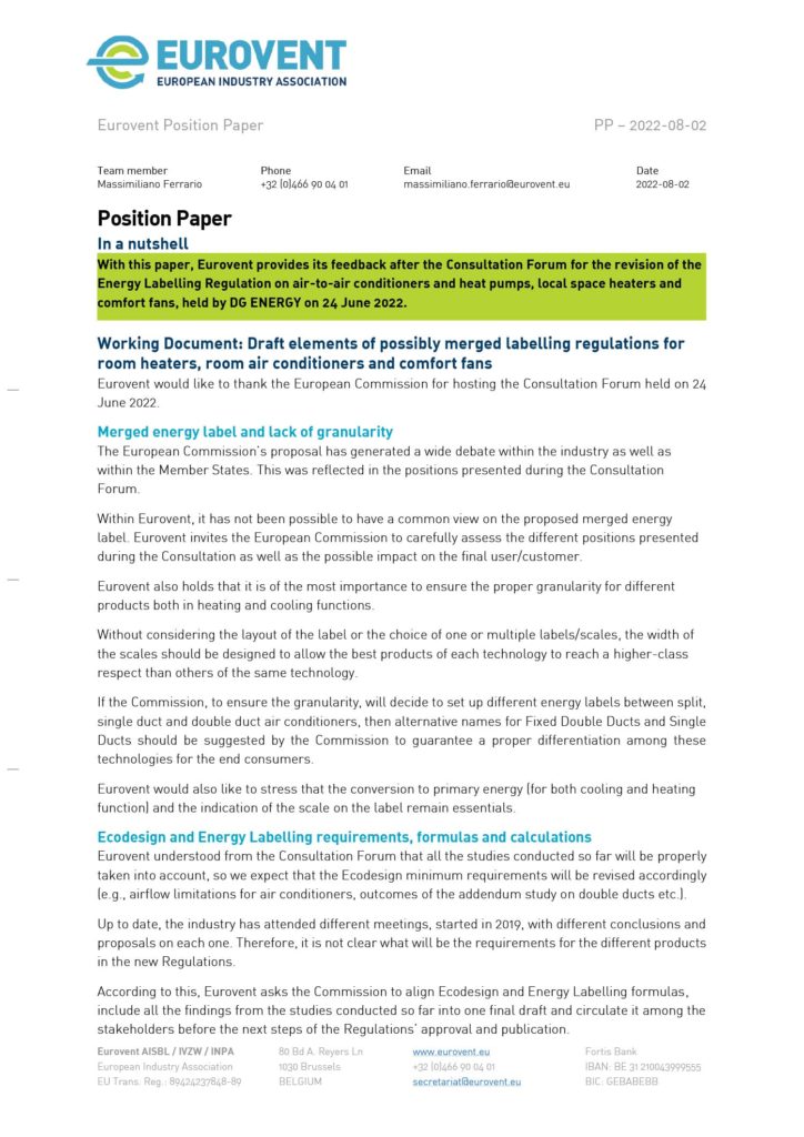 With this paper, Eurovent provides its feedback after the Consultation Forum for the revision of the Energy Labelling Regulation on air-to-air conditioners and heat pumps, local space heaters and comfort fans, held by DG ENERGY on 24 June 2022.