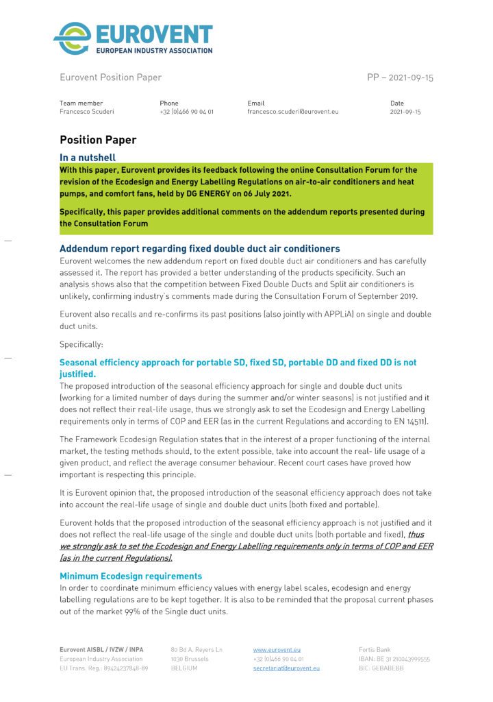 With this paper, Eurovent provides its feedback following the online Consultation Forum for the revision of the Ecodesign and Energy Labelling Regulations on air-to-air conditioners and heat pumps, and comfort fans, held by DG ENERGY on 06 July 2021. Specifically, this paper provides additional comments on the addendum reports presented during the Consultation Forum.