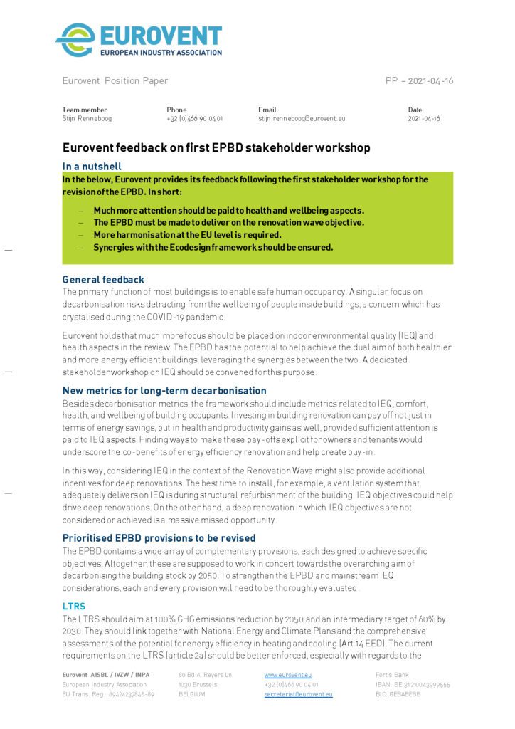 In the below, Eurovent provides its feedback following the first stakeholder workshop for the revision of the EPBD. In short: