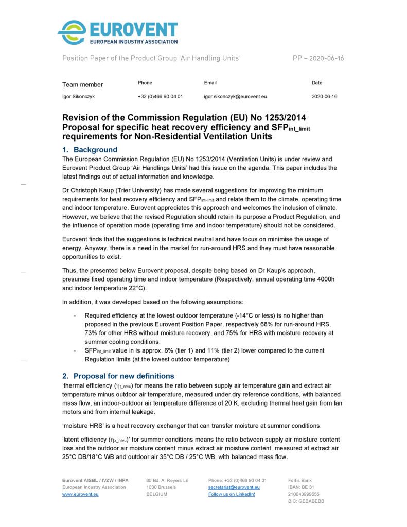 The European Commission Regulation (EU) No 1253/2014 (Ventilation Units) is under review and the Eurovent Product Group ‘Air Handling Units’ (PG-AHU) had this issue on its agenda. This Position Paper includes the latest findings out of actual information and knowledge.