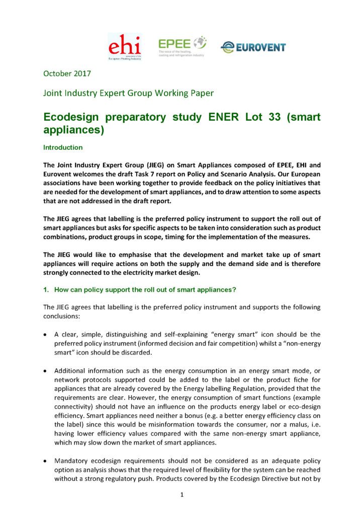 The Joint Industry Expert Group (JIEG) on Smart Appliances composed of EPEE, EHI and Eurovent welcomes the draft Task 7 report on Policy and Scenario Analysis. Our European associations have been working together to provide feedback on the policy initiatives that are needed for the development of smart appliances, and to draw attention to some aspects that are not addressed in the draft report. The JIEG agrees that labelling is the preferred policy instrument to support the roll out of smart appliances but asks for specific aspects to be taken into consideration such as product combinations, product groups in scope, timing for the implementation of the measures. The JIEG would like to emphasise that the development and market take up of smart appliances will require actions on both the supply and the demand side and is therefore strongly connected to the electricity market design.