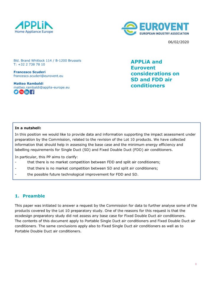 In this position we would like to provide data and information supporting the impact assessment under preparation by the Commission, related to the revision of the Lot 10 products. We have collected information that should help in assessing the base case and the minimum energy efficiency and labelling requirements for Single Duct (SD) and Fixed Double Duct (FDD) air conditioners. In particular, this PP aims to clarify: