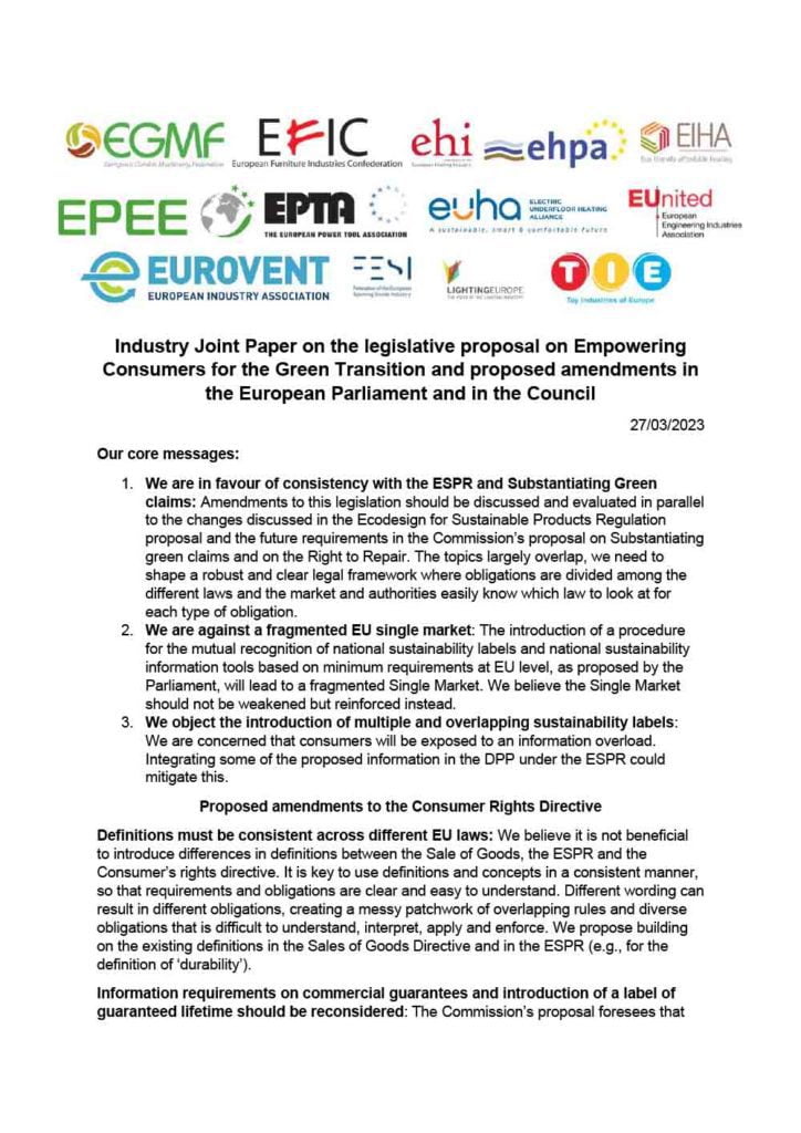 Industry Joint Paper on the legislative proposal on Empowering Consumers for the Green Transition and proposed amendments in the European Parliament and in the Council.