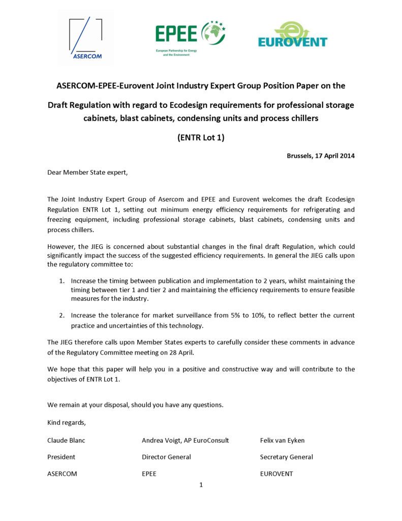 ASERCOM-EPEE-Eurovent Joint Industry Expert Group Position Paper on the Draft Regulation with regard to Ecodesign requirements for professional storage cabinets, blast cabinets, condensing units and process chillers (ENTR Lot 1).