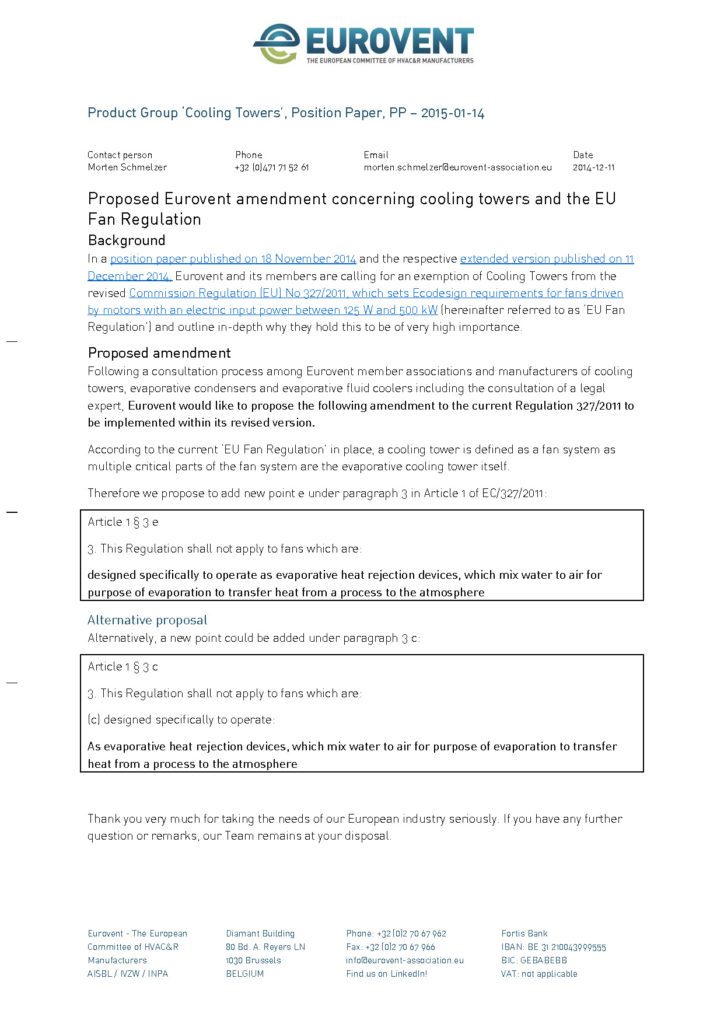 Following a consultation process among Eurovent member associations and manufacturers of cooling towers, evaporative condensers and evaporative fluid coolers including the consultation of a legal expert, Eurovent would like to propose the following amendment to the current Regulation 327/2011 to be implemented within its revised version.