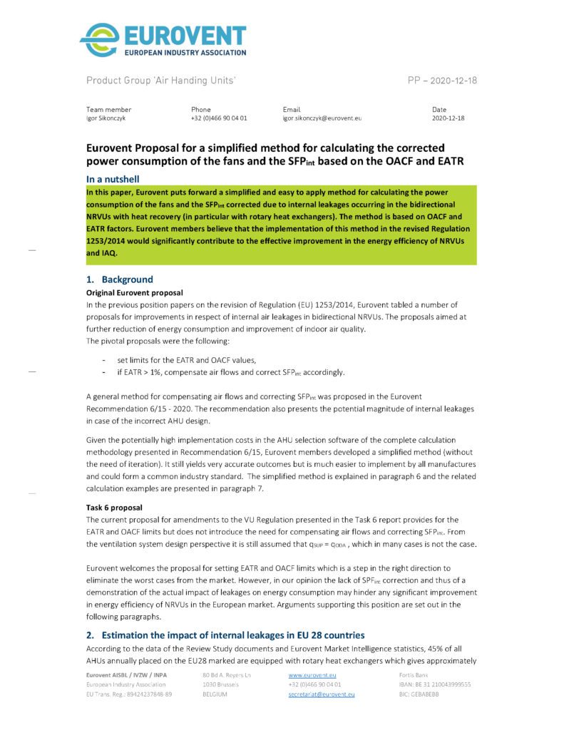 In this paper, Eurovent puts forward a simplified and easy to apply method for calculating the power consumption of the fans and the SFPint corrected due to internal leakages occurring in the bidirectional NRVUs with heat recovery (in particular with rotary heat exchangers). The method is based on OACF and EATR factors. Eurovent members believe that the implementation of this method in the revised Regulation 1253/2014 would significantly contribute to the effective improvement in the energy efficiency of NRVUs and IAQ.